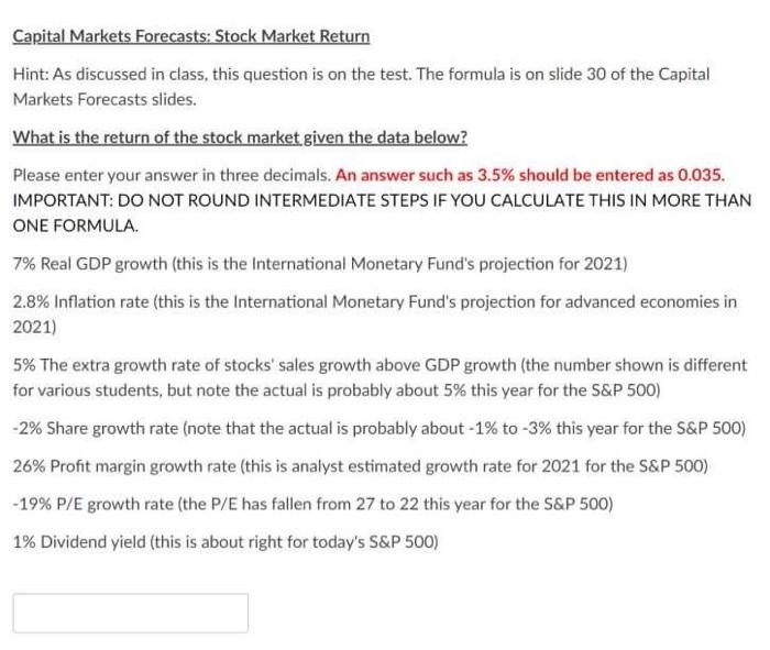 Capital Markets Forecasts Stock Market Return Hint Chegg Com